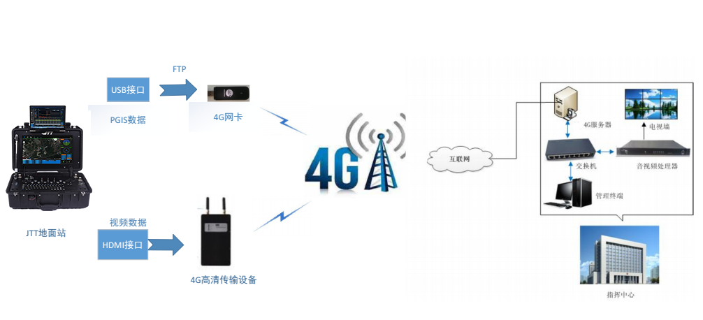 無人機在巡檢時高空拍攝到的圖像和視頻以及無人機的坐標、高程信息通過無線通信鏈路傳輸?shù)降孛嬲竞?,可通過專用有線網(wǎng)絡(luò)與現(xiàn)場的移動前置機形成數(shù)據(jù)通路,也可借助4G網(wǎng)絡(luò)把數(shù)據(jù)輸入到內(nèi)網(wǎng)的數(shù)據(jù)庫中并連通到應(yīng)急指揮調(diào)度平臺。通過這種方式,巡檢現(xiàn)場的第一手資料與龐大的數(shù)據(jù)庫之間就形成了協(xié)同作戰(zhàn)的態(tài)勢。無論是領(lǐng)導(dǎo)指揮還是第一線巡檢人員的具體執(zhí)行都將得到有力、有效和迅速的信息支撐。