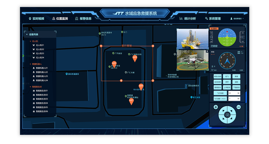 2021年10月,廣州珠江某河段,一名市民在橋上觀光時(shí)不慎落水,墜入江水中央,離岸較遠(yuǎn),水流湍急,情況十分危急。但是,該河段已提前部署智璟無(wú)人化水域應(yīng)急救援系統(tǒng),落水人員在進(jìn)入此水域時(shí)就已被附近的AI攝像頭捕捉到信息。在人員落水的一瞬間,觸發(fā)系統(tǒng)報(bào)警,系統(tǒng)自動(dòng)調(diào)度部署在落水點(diǎn)最近的水上救援機(jī)器人與正在巡邏的無(wú)人機(jī)同時(shí)前往救援。無(wú)人機(jī)投放救生包,救援機(jī)器人接住落水者,短短1分鐘便將落水者救上岸。后臺(tái)指揮中心實(shí)時(shí)監(jiān)控和指揮調(diào)度整個(gè)救援過(guò)程。