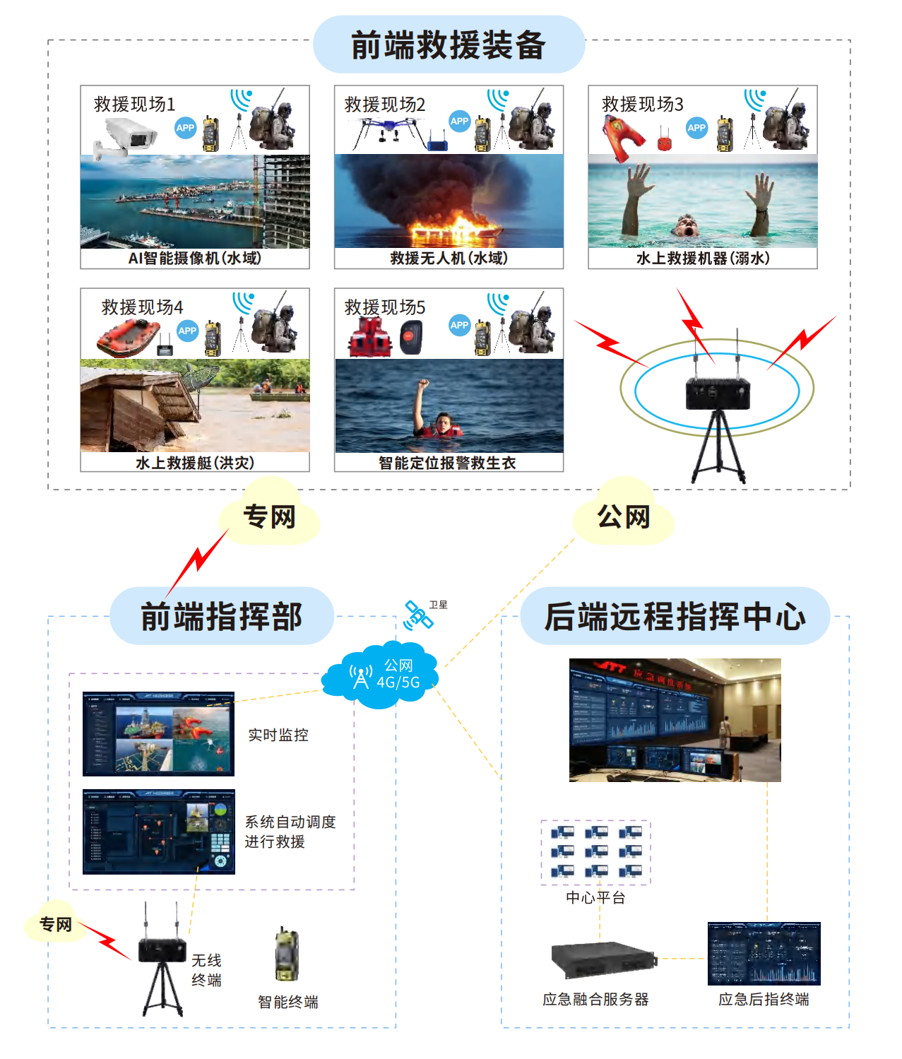 1,據(jù)網(wǎng)絡(luò)情況,選公網(wǎng)+專網(wǎng)通信,選指前端指揮部,一線人員進(jìn)入現(xiàn)場打開現(xiàn)場指揮中心、前端救援裝備,前端(A!智能攝像機(jī)、水上救援機(jī)器人、水上救援艇、無人機(jī)、智能定位報(bào)警救生衣等)接入現(xiàn)場指揮中心,現(xiàn)場指揮中心自動接入后端遠(yuǎn)程指揮中心;
