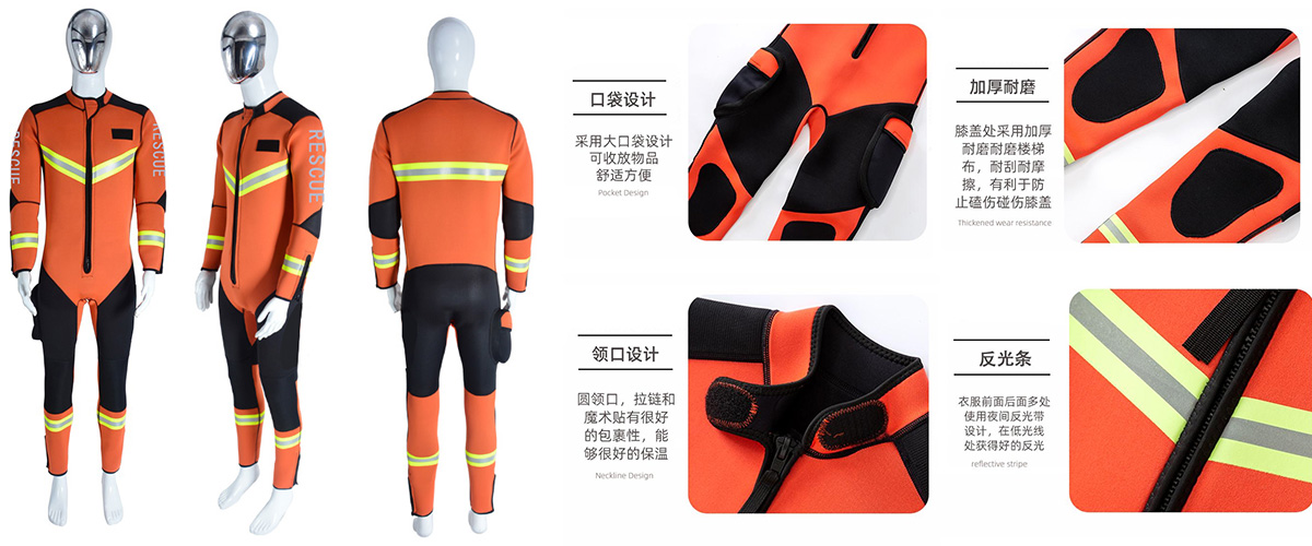 - ZJ038-B濕式救援服:采用3mm鈦涂層氯丁橡膠,極致柔韌,活動(dòng)自如。雖為濕式設(shè)計(jì),但通過(guò)特殊材質(zhì)和工藝,確保保暖、靈活、耐磨三者平衡,尤其適合需要大量游泳或高強(qiáng)度活動(dòng)的救援場(chǎng)景。