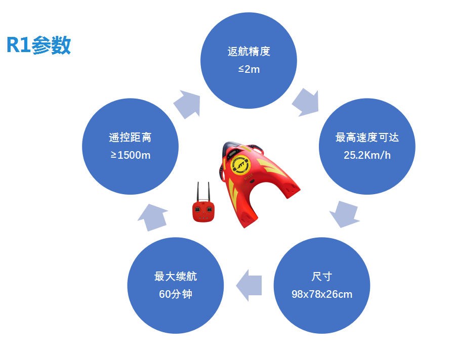 R1水上救援機(jī)器人功能特性R1水上救援機(jī)器人是政府應(yīng)急、民間各類(lèi)水上救援組織的標(biāo)準(zhǔn)救援設(shè)備,適用于大海、水庫(kù)、江河、湖泊、洪水等水上救援應(yīng)用場(chǎng)景。全程快速救援:空載航速度高達(dá)7m/s,可快速到達(dá)落水者身邊進(jìn)行施救,爭(zhēng)取黃金救援時(shí)間。