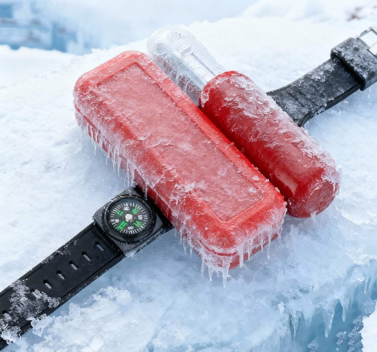 拉開控制桿,手腕盒中彈出氣囊迅速充氣膨脹,形成浮力裝置,協(xié)助漂浮在水面,表帶上配有指南針